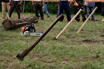 A versenyre előkészített motorfűrész és hasítófejszék.