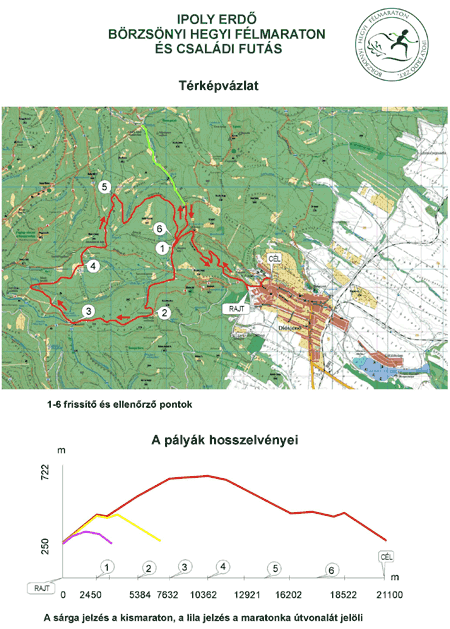 Versenyközpont: Diósjenő Camping Öltöző, ruhatár: Diósjenő Camping A versenyen minden nevező egyénileg vesz részt! Félmaraton (21,1 km) Rajt: 11.00 órakor, az Ipoly Erdő Zrt. Diósjenői Erdészetének bejárati útjánál Szintkülönbség: 450 méter. Az útvonal épített erdészeti út, szilárd burkolatú (aszfalt és makadám), illetve burkolat nélküli - az elágazásoknál szalaggal jelölve.Szintidő: 3:00 óra. A részvétel alsó korhatára a betöltött 16. életév. Útvonal: Rajt (Diósjenő-Kemence út erdészeti bekötőjénél) - Závoz-tető - Mázsaház - Magashegyi rakodó (Gál-rét mellett) - Őzberek - Verebes kaszáló - Foltán-kereszt - Musli barakk - Nyírrét - Hárombarát - Halmos kanyar (a Streck úton) - Kemence-patak gázlója - Királykút - Mázsaház - Závoz-tető - Cél (Diósjenő Camping) Kismaraton (7,0 km) Rajt: 11.15 órakor, az Ipoly Erdő Zrt. Diósjenői Erdészetének bejárati útjánál Szintkülönbség: 240 méter. Az útvonal szilárd burkolatú és burkolat nélküli. Szintidő: 1:30 óra. A részvétel alsó korhatára a betöltött 12. életév. Maratonka (3,1 km) Rajt: 11.30 órakor, az Ipoly Erdő Zrt. Diósjenői Erdészetének bejárati útjánál Szintkülönbség 100 méter. Az útvonal szilárd burkolatú és burkolat nélküli. Szintidő: 40 perc. Részvételi korhatár nincs. A cél helye:Valamennyi versenyszám résztvevője részére a Diósjenői Camping Versenyközpont.