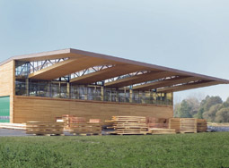 Az építészek az építtetők követelményinek megfelelően egy olyan héjszerkezetet fejlesztettek ki, amelyik a nyugati oldalon a talajtól indul, lefedi a csarnokot, majd a keleti oldalon az előtető a rakodó rész felett kiszélesedik. Logisztikai szempontok miatt a három termelői részleg teljes déli oldala nyitott. A héjszerkezet üvegezett részei összekötik a belsőt a külsővel, a munkát a természettel, valamint a megvilágítás is megoldódik a természetes fénnyel. Építtető: Obermayr Holzkonstruktionen GmbH Építész: F2-Architekten ZT GmbH, Schwanenstadt Épületenergetika: design AID, Haidershofen