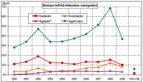 Tóth Eszter, az MBFSZ ügyvezetője szerint az építőipar megtorpanása és a körbetartozások jelentik a hazai bútorgyártók legkomolyabb problémáit, a rendelésállomány erősen visszaesett, gyakran egy hónapnál messzebb nem látnak a cégek. A globális válság következtében a belföldi és az exportpiacokra is csak nyomott árakon tudnak értékesíteni. A távolabbi kilátások tekintetében a hazai gyártók az exportpiacok fellendülésében, valamint a hazai bútorvásárlási szokások és fogyasztói magatartás pozitív változásával a visszaesés lassulásában, 2011-ben pedig a kereslet lassú növekedésében bíznak. A bútorgyártás az idei első negyedévben 28,83 milliárd forint értékben termelt, belföldi árbevétele 9,55, exportforgalma pedig 19,3 milliárd forint volt. A termelés éves szinten az első negyedévben ötödével esett vissza, a hazai eladások pedig a tavalyi első negyedév 49,3 százalékos zuhanása után idén január és március között további 26,8 százalékkal csökkentek. Ennél jóval kisebb ütemben szűkült a kivitel: az exportértékesítés 16,8 százalékkal múlta alul az egy évvel korábbit az első negyedévben. Márciusban a termelés már csak 17,2, a belföldi értékesítés azonban 27,9, az export pedig 10,5 százalékkal volt alacsonyabb, mint 2009 azonos időszakában.