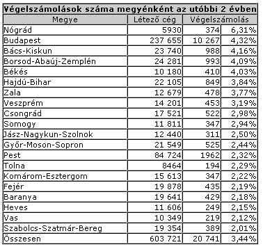Az eljárások száma megkétszereződött Az elmúlt két esztendőben a korábbiaknál lényegesen több cégtulajdonos döntött úgy, hogy megszünteti működését. A 2008 közepe óta számított gazdasági válság kezdetétől összesen 20 741 cég végelszámolására került sor. Az ezt megelőző tíz esztendőre visszatekintve: évente négy-ötezer cég szűnt meg ilyen módon, 2009-ben viszont 11 443, az idén pedig már az első fél évben több mint hétezer, és a prognózisok szerint év végére ez a szám akár tizenötezerig is nőhet. A statisztikát részletesebben vizsgálva kiderül, hogy egyes térségeket az átlagnál is jobban sújtotta a krízis. A létező cégek számához viszonyítva a legnagyobb arányú végelszámolásra Nógrád megyében került sor, ahol 5930 működő vállalkozás mellett 374 (6,31%) jutott erre a sorsra. Borsod-Abaúj-Zemplénben 993 társaság végelszámolására került sor, ez 4,09 százalékot jelent. Négy százalék feletti a végelszámoltak aránya Bács-Kiskun (4,16%) és Borsod-Abaúj-Zemplén megyében (4,09%). Szám szerint a legtöbb céget, 1962-t Pest megyében "végelszámolták", ám ez a 84 724 létező vállalkozáshoz mérten "csak" 2,32%-ot jelent.