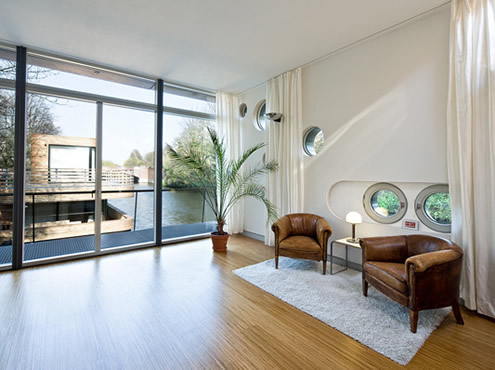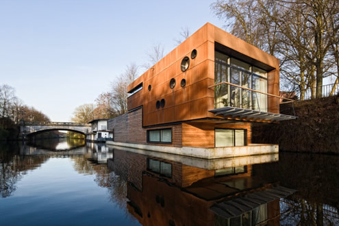 A 116 négyzetméteres lakóhajó két kubusból áll, amelyek egy 29x6 x1,70 méteres beton pontonon állnak. Itt tulajdonképpen a hajó kifejezés nem is igazán pontos, mert egyhelyben álló építményről van szó. Az épület favázas szerkezettel készült, a felső rész az alsóról leválasztható, hogy a későbbiekben szállítható és a hidak alatt is átvihető legyen. Ez a váltás kívülről is látszik: a felső kubust corten acéllal burkolták, a hamburgi ipari kikötőre emlékeztetve. Az alsó kubus kezeletlen vörösfenyő burkolatával a tradicionális hajóépítésre rímel. A belső terekben is sok fát használtak, ez a fehérre festett falakkal együtt a tenger hangulatát lopja be az épületbe.