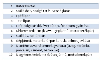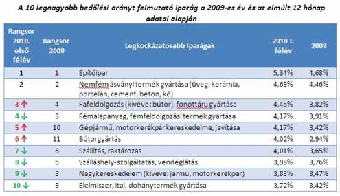 A listát egyértelműen a válság által érintett, és sokszor egymáshoz is kapcsolódó ágazatok vezetik. Az építőipari rendelések csökkenése, pénzügyi stabilitásuk zuhanása magával húzza az üveg, kerámia, porcelán, cement, beton, kő termékek gyártóit, a fafeldolgozás terén működő vállalkozásokat is. A fogyasztói kereslet visszaesésének, a beruházások, bútor és gépjárműcserék elodázásának köszönheti nehéz helyzetét például a bútorgyártás, ahol az import termékek is komoly konkurenciát jelentenek a belföldi piacon. A kevésbé kockázatos iparágak esetén sem megnyugtató a helyzet Humán-egészségügyi, szociális ellátásban csupán a cégek 16 százaléka tartozik a legnagyobb kockázatú Rating 4-es kategóriába. Kevesebb kockázatos céget vonultatnak fel a többi szektorhoz képest az oktatási tevékenységet, a szakmai, tudományos, műszaki tevékenységet és az ipari gép, berendezés, eszköz javítását végző ágazatok. A kockázatos cégek aránya azonban itt is meglehetősen magas, ahhoz, hogy a pénzügyi szakemberek és a kockázatkezelők nem dőlhetnek hátra.