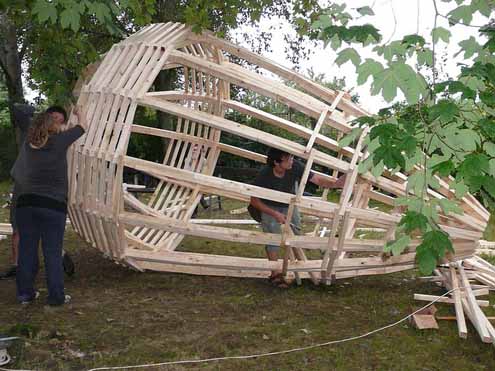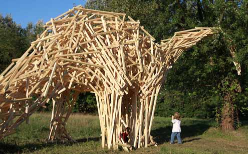 Pozsár Péter csapata az 1000 méter lécet hosszabb-rövidebb darabokra fűrészelve az egyik fiatal fa lombkoronájába épített fészket. Ez aztán megszakítás nélkül a környező tereptárgyak közt kígyózva végül egy négyszögletes barlangba torkollik, példázva ezzel a házak két archetípusát. Érdekes megoldást választottak a szerkezet rögzítésére is, a csavarok helyett az egyes fadarabok végeibe fúrt lyukaknál fogva madzaggal csomózták össze. Huszár Andris spontán helyett inkább virtuóz csapata egy háromméteres tojás alakú szerkezetet készített, amely homokzsákokkal megpakolva a keljfeljancsihoz hasonlóan fog újra és újra visszabillenni eredeti helyzetébe bármilyen lendületes kitérés után is. A legrizikósabb kísérleteket stílszerűen Losonczi Áron építész és feltaláló vezényelte le: az eredeti hosszúságában meghagyott fenyőléceket minél magasabbra nyújtóztató, több emeletnyi konstrukció mellett egy nagy távolságokat áthidalni képes négyzetrácsos szerkezetet is készítettek, amelynek teherbírását végül a helyszínen ki is próbálták. Elmondhatjuk viszont, hogy a helyszínen járó kibicek és gyerekek egyöntetűen Szőke Gábor Miklós csapatának tizenhétméteres dínóját zárták a szívükbe. A békés növényevőt egy kisebb makett alapján, a változatos hosszúságú léceket spontán módon egymáshoz csavarozva alig három nap alatt valósították meg a csapattagok. A fej és a farok a törzsről leszerelhető, így a többi installációval együtt ezt a munkát is viszontláthatjuk a designhéten.