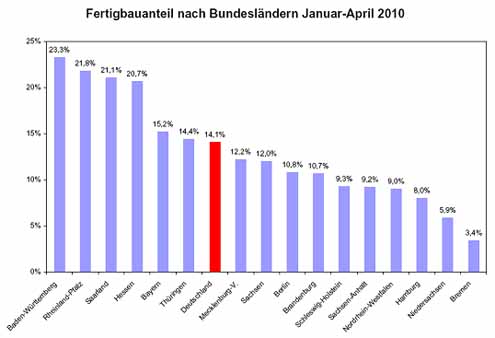 Készház termékek aránya délnyugaton a legmagasabb Az elsősorban fából gyártott készházak a Német Szövetségi Köztársaság délnyugati részén a legkedveltebbek. Banden-Württembergben, Reinland - Pfalzban, Saarlandban és hessenben több mint minden ötödik ház készház. Németország szerte, a 2010 első 4 hónapjában épült, egy és kétlakásos családi házak 14,1 %-a készház volt. Az éllovas 23,3%-kal Baden-Württemberg és az utolsó Bremen 3,4%-kal.