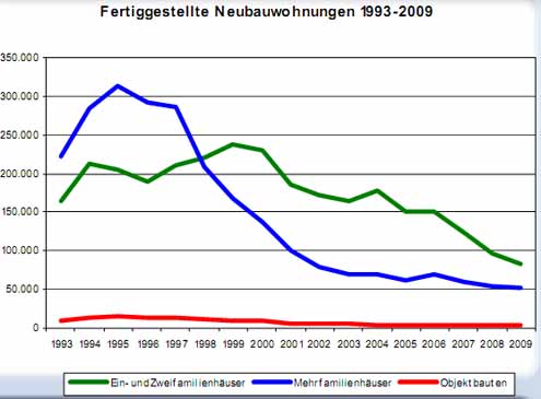 Készházak részesedése az összes éptkezésből tartományonként Mélyponton a lakásátadás 2009-ben lakás átadások száma 10%-kal csökkent, így a számuk 140.166-ra ugrott vissza. 1995 óta, amikor 524.606 lakás átadással elérte a csúcspontját, évente csökkent a számuk, 2009-re 72% csökkenéssel elérte a legalacsonyabb értékét a német egyesítés óta. Az egy családos családi házak száma 12,4%-kal és két családos családi házak száma 15,2%-kal esett vissza. Ugyancsak visszaesett a többcsaládos családi házak átadása (-5,8%).