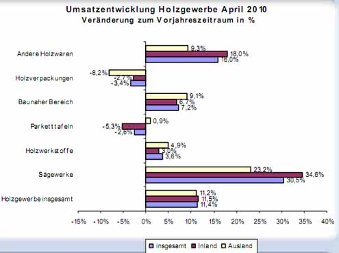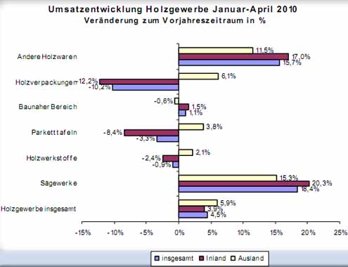 Grafikon címe: Fatermékek forgalmi adatai az előző év azonos időszakához viszonyítva Faipar: jó április 4,5%os plusszal A élénkülés egyre nagyobb: ez előző évhez képest áprilisig 4,5%-al növekedett a forgalom. A belföldi forgalom 3,9%-al növekedett, míg a külföldi forgalom 5,9%-al erősödött. Negatívan érintett még mindig a fa alapú csomagolások, a parkett és a nyers faanyagok területe, amelyek 10,2%-ot, 3,3%-ot és 0,9%-ot gyűjtöttek be. Ám külföldön továbbra is könnyű és közepes mértékű növekedésről számolhattak be. Növekedést a más fatermékek és a fűrészüzemek értek el, 15,7 illetve 18,4%-al.