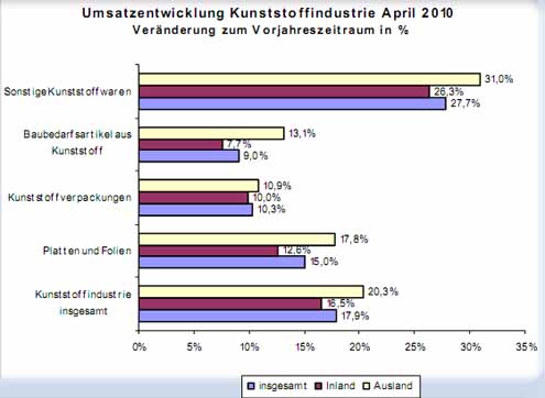 Grafikon címe: Fatermékek forgalomnövekedése 2010 januártól áprilisig. Áprilisban szárnyalt a műanyagipar A műanyagipar forgalma tovább növekedett: 2010 áprilisában 17,9%-ot emelkedett. Újabb csúcseredményt értek el az egyéb műanyagtermék 37,7%-kal. Ehhez nagyban hozzájárult a 31%-al növekedett külföldi piac is. De a belföldi piac is dübörög a 26,3%-al. Továbbra is élénken fejlődik az építőipari műanyagok 9%, műanyag csomagolások 10,3% és lemezek és fóliák, majdnem, mint a múlthónapban, 15% plusszal.