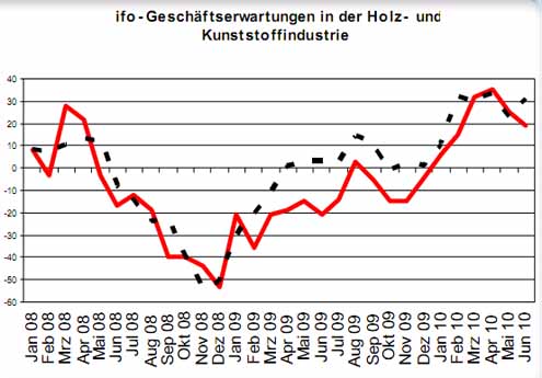 Grafikon címe: Műanyagipar forgalomnövekedése 2010 április Az előző évi adatok százalékában Változások a tavalyihoz képest Hullámvasút Az üzleti elvárások egy hullámvasút utazásra emlékeztetnek: amíg a faipar értéke 25 pontról 19 pontra süllyedt, addig a műanyagipar júniusban 23 pontról, a 31 pontig kúszott felfelé. Azt, hogy a faipar továbbra is mélyen marad-e, azt majd megmutatatják a következő hónapok. Általános tapasztalat szerint ez a terület kisebb késéssel követi a többit.