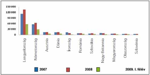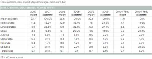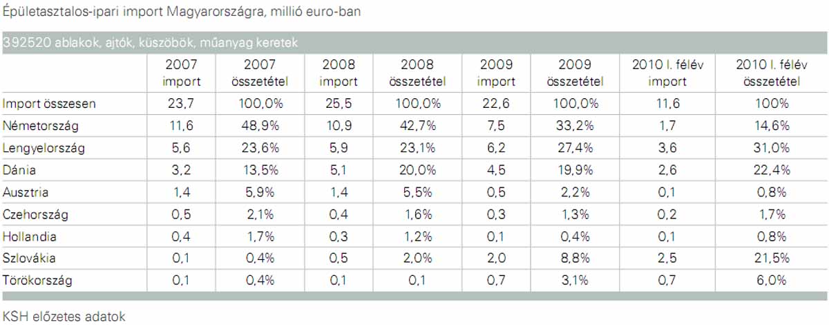 2009-ben a lengyel műanyag ablakok és ajtók részesedése az össz magyar importból 27,4%-ra nőtt. A beszállítások dinamikája pozitív volt, a Lengyelországból származó import (az építőipari recesszió ellenére) 5,1%-kal növekedett. Figyelemre méltó a szlovákiai behozatal háromszoros növekedése - lehetséges, hogy ez a magyar gyártási kapacitás egy részének Szlovákiába telepítéséről tanúskodik. A Németországból származó import - mely mindmáig értékében a legnagyobb - 31%-kal csökkent. 2010. első felében lengyel termékek importja 77%-kal nőtt, a részesedése elérte 31%-ot. A 392530 termékcsoport (ablakok, ajtók, redőnyök - és ezek alkatrészei) esetében a Lengyelországból származó import 2009-ben 384 ezer euro (107,5 millió Ft*) értékű volt (ami 1,8%-os csökkenés), mely e termékcsoportban az összes import 7,5%-át tette ki. A legfőbb konkurenciát e csoportban a Németországból származó import (30,5%-os részesedés) és a Cseh Köztársaságból történő behozatal (20,9%-os részesedés) jelentették. A 441810 termékcsoport (fa ablakok és erkélyajtók) importja esetében három év alatt a Lengyelországból származó import 10%-ról 30,3%-ra növelte részesedését - a 2007. évi 2 millió euro-ról (502 millió Ft*) a 2009. évi 3,5 millió eurora (980 millió Ft*). 2009-ben e csoportban a lengyelországi behozatal növekedése 75%-ot ért el! Ez volt a Magyarországra irányuló lengyel export egyik leggyorsabban növekvő termékcsoportja. A legfőbb konkurenciát e csoportban a Németországból származó import (1,9 millió euro [532 millió Ft*],15,5%-os részesedés) és Romániából történő behozatal (1,2 millió euro [336 millió Ft*], 10%-os részesedés) jelentették. A fa ajtók és küszöbök termékcsoportja (vámtarifa 441820) esetében a lengyelországi import - 0,9 millió euro (252 millió Ft*) értékben - 9,1%-ot képviselt az össz behozatalból. Legnagyobb részesedéssel az importon belül a Romániából származó behozatal bír, ami 41,4% és 4,1 millió euro (1.148 millió Ft*) értékű. A többi országból származó import nem haladja meg a néhány százezer eurót. 2009-ben a Lengyelországból származó fa ajtók importja kb. 55%-kal csökkent. A fenti adatokból következően Lengyelország vezető helyen áll a fa, míg második helyen a műanyag ablakok magyarországi importjában. A kedvezőtlen magyarországi helyzet ellenére mindkét esetben - időnként nagyon gyors ütemben - nőtt az import. A fa ajtók és műanyag alapanyagú ablak- ajtó- és redőnyalkatrészek terén is jelentős beszállítónak számítunk.