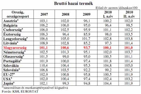Az EU-27 gazdasági teljesítménye - szezonálisan és munkanaphatással kiigazítva - 1,9%-kal emelkedett az egy évvel korábbihoz képest. Ilyen mértékű bővülés az elmúlt két évben nem volt. A növekedés motorja Németország, teljesítménye 3,7%-kal haladta meg az egy évvel korábbit. A német növekedés alapja a Kínába irányuló export jelentős bővülés volt. Számottevő (2%nál magasabb) teljesítménybővülést mértek Észtországban (3,5%), Finnországban (3,1%), Lengyelországban (3,8%), Svédországban (3,6%) és Szlovákiában (5%). A többi adatot szolgáltató tagállamban átlag körüli volt a növekedés mértéke. Kivételt képez Görögország ahol folytatódik a gazdaság teljesítményének csökkenése. Az USA GDP-je 2010 II. negyedévében 3,2%-kal b ővült, az egy évvel korábbihoz képest. A háztartások fogyasztási kiadásai 1,6%-kal, a bruttó belföldi beruházások 23,9%-kal növekedtek. A teljesebb összkép érdekében bemutatom néhány számunkra meghatározó ország, illetve országcsoport főbb adatait: