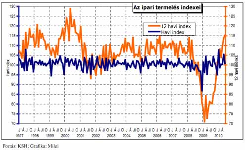 2009-ben a hazai ipar teljesítményét alapvetően a gazdasági válság miatti piacvesztés határozta meg. 2010 első félévében a külpiaci lehetőségek javulása és a múlt évi alacsony bázis az ipari termelés volumenének 9%-os növekedését eredményezte Az időszakon belül a két negyedévben határozott élénkülés figyelhető meg. Az ipar teljesítménye az első negyedévben 5%-kal, a másodikban 13%-kal nőtt. A termelésnövekedés mögött az exportra termelő ágazatok teljesítménynövekedése áll. A feldolgozóipar termelése az év els ő hat hónapjában 10,6%-kal volt magasabb az egy évvel korábbinál. Júniusban 16,9%-kal emelkedett a feldolgozóipar teljesítménye. A nagy súlyú ágazatok közül a járműgyártásban 22,6%-os, a számítógép, elektronikai, optikai termék gyártásában 17,8%-os volt a bővülés mértéke a félév során. Júniusban értelemszerűen 23,2%, illetve 35,7% volt a növekedés üteme. 2010 január-júniusában - a létszám-kategóriák szerint képzett vállalatcsoportok közül - a nagyvállalkozások (250+ f ő) termelése 11,1%-kal, a közepeseké 8,5%-kal emelkedett 2009 első félévéhez képest. A pozitív változás elsősorban az exportra termelő vállalkozások és azok beszállítói teljesítményének növekedéséből adódik. A kisvállalkozói kör teljesítménye 1,7%-kal csökkent ebben a félévben is, mivel ezen vállalkozói kör többnyire a hazai piacra termel.