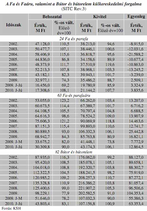 2010 I. félévében a külkereskedelmi forgalom export volumene 18%-kal, az importé 15%-kal b ővült az egy évvel korábbihoz képest. Az euróban számított kivitel volumene 21%-kal, a behozatalé 17,4%-kal bővült. A külkereskedelmi mérleg 2.860 millió euró többletet mutatott, az el őző évi 1.590,5 millió euróval szemben. Ez 1.269,5 millió euró javulást jelent. A külkereskedelmi forgalom forintárszintje exportban és importban 4,5%-kal csökkent az el őző év azonos időszakához képest, így a cserearány lényegében nem változott. A forint az euróhoz viszonyítva mintegy 6,4, a dollárhoz képest pedig 6%-kal értékelődött fel. A 2010 I. félévében a kivitel összessége 78-22 arányban, a behozatalé 69-31 arányban oszlott meg az EU tagállamai, illetve az unión kívüli országok között. Az új tagállamokkal (12 újonnan csatlakozott) folytatott külkereskedelemben az import 15,1%-os, az export 19,4%-os részt képvisel. Az ezen országokba irányuló forgalom dinamikája az átlag körüli ütemben emelkedett, az export euróban 21,1%-kal, az import 17,5%-kal emelkedett. A régi tagállamokba irányuló export 18,5%-kal, az import 16%-kal emelkedett. Az Unió egészét tekintve a kivitel 19,1%-kal a behozatal 16,3%-kal volt magasabb, mint egy évvel korábban. Az unión kívüli országokkal folytatott kereskedelemben a kivitel 28,1%-kal, a behozatal 20%-kal haladta meg az egy évvel korábbit. 2010 júniusában a külkereskedelmi forgalom volumene mind exportban, mind importban jelentős mértékben emelkedett, a kivitel 19,8%-kal, a behozatal 14,5%-kal volt magasabb mint egy évvel korábban. Az euróban számított kivitel 24,5%-kal, a behozatal 20,9%-kal nőtt a 2009 júniusi szinthez képest. A fa alapanyagok 2010. I. félévi forgalma pozitív egyenleggel zárt, mértéke meghaladja a 3,8 milliárd forintot. A behozatal forintban 8,1%-kal, kivitelünk pedig 7,7%-kal nőtt. A fatermékek kivitele ez év első félévében 6,1%-kal emelkedett, míg behozatalunk 10%-kal mérsékl ődött. Az egyenleg jelentős mértékben növekedett az export és import ütemnövekedésének jelent ős különbsége miatt, így az 65%-kal meghaladja az egy évvel korábbit.