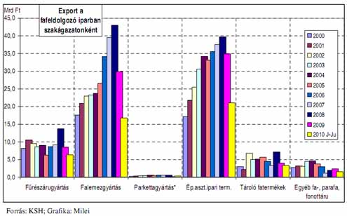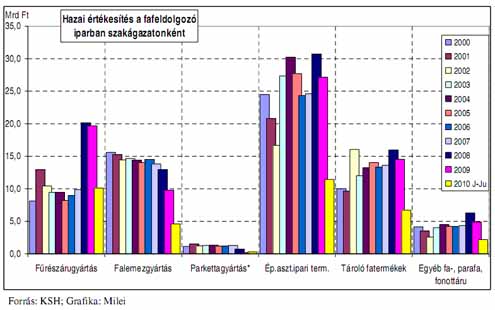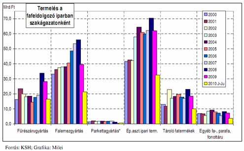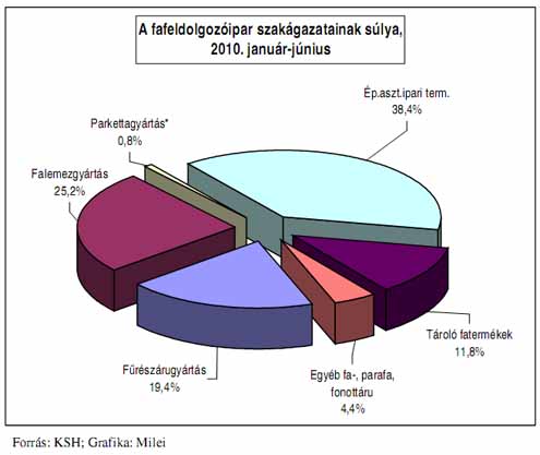 A fafeldolgozó-ipar termelése 2010 I. félévében 20,7%-kal nőtt az egy évvel korábbihoz képest, ebben az igen alacsony bázis is közrejátszott (2009 január-júniusban a termelés 31,5%-kal csökkent). 2010 júniusában 1,5%-kal bővült a termelés az előző év 2%-os csökkenést követően. A szakágazat hazai értékesítése ez év első hat hónapjában 2,5%-kal, júniusban 23,4%-kal csökkent. Az exportértékesítés 39,2%-kal növekedett 2010 I félévében, júniusban pedig 44,4%-kal b ővült a szakágazat kivitele az egy évvel korábbihoz képest.