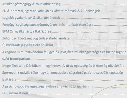 Ez a kiadvány a tárgyban megrendezett európai szeminárium alapján készült. A projekt szintén kezdeményezi egyes információk összegyűjtését a különböző EU tagországokban a munkaegészségügy és munkabiztonság szabályozásának változásáról, kifejezetten érintve bizonyos kibocsátási határértékeket, melyek eltérnek az egyes országokban, vagy EU szabályozás hiányában egyik országban törvénysértőek, míg a másikban nem. Az operativ bizottság összeállított egy válogatást a kilenc legjobb gyakorlatból, azzal a céllal, hogy segítsen a cégeknek az EU szabályokhoz igazodni, finanszírozva a társadalombiztosítási rendszer által teremtett lehetőségeket vagy javaslatok megfogalmazásával a pszichoszociális egészségügy terén. A projekt partnerektől remélik, hogy az ebben a brossúrában felsorolt legjobb gyakorlatokat folytatják saját országukban és több más ország is követi majd a példát elősegítve ezzel a bútoripari szektor munkaegészségügyi és munkavédelmi helyzetét.