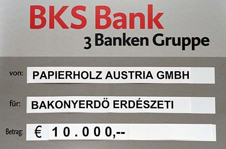 Varga László a Bakonyerdő és dolgozói nevében megköszönte az adományt és meghívta Kurt Maiert, illetve Manfred Schachenmannt és Klaus Krammert a Devecseri Erdészet épület újjáépítése utáni avatási ünnepségre. Az erdőgazdaság 2010. novemberében létrehozta A Mi Bakonyunkért Alapítványt (székhelye: Pápa), melynek számos célja között szerepel az erdőgazdaság dolgozóit ért rendkívüli helyzetek esetén a kárenyhítés. A Papierholz Austria GmbH ezen alapítvány számlájára utalta át a fenti adományt.