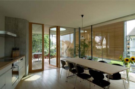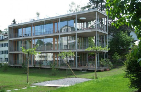 Svájcban épült a 4 lakóegységet magába foglaló minősített passzívház. Az energetikai számításba bevont terület: 408 m2. Talán nem véletlen, svájci épületről lévén szó, ez az épület is faház. Itt nagy szerepet játszanak az üvegfelületek eneregetikai értékei, hiszen különösen nagy üvegfelületekkel oldották meg az épület homlokzatát. Fa nyílászárók kerültek beépítésre, Uw értékük: 0.8 W/m2K. Az üvegek naptényezője, g: 55%. Az üvegezés U értéke pedig, Ug: 0.5 W/m2K. A gépészeti rendszer pellet kazán, amely mind a melegvíz előállítását végzi, mind pedig a fűtési igény kielégítését is ezzel oldják meg.