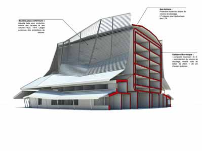 A 17 méter magas, hatszintes "iratsiló" kívülről láthatatlan: eltakarja az épület árnyékolásáról gondoskodó lamellarendszer. A kiszélesedő alsó résznek köszönhető az épület jellegzetes formája, amely a tervezők szándéka szerint a Francia-Guyanában hagyományosnak tekinthető kunyhó-formát idézi. A homlokzatot az teszi különösen izgalmassá és dinamikussá, hogy az egyes lamella-lemezek elcsúsznak, egymásra torlódnak.