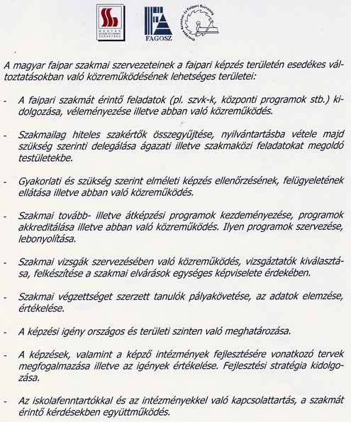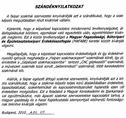 A nyilatkozatot a MAFABE résztvevői, a Fagazdasági Országos Szakmai Szövetség, a Magyar Bútor és Faipari Szövetség, és az Országos Asztalos és Faipari Szövetség elnökei írák alá. Kapcsolódó FATÁJ írások: Megállapodás a szakképzési feladatokról (2010-11-19) Változik a képzés: munkahelyek a szakmunkásoknak (2011-01-18) Tóth János, FATÁJ