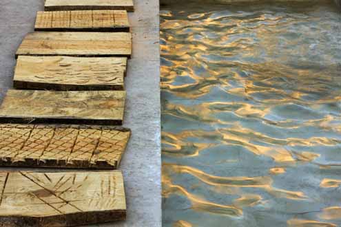 Az előző este közösen elmentünk egy fűrésztelepre, ahol hulladékfa minőséggel megpakoltunk egy teherautót. A szimpózium kezdetekor egy kupac fa - jobbára széldeszka - várta a résztvevőket. A finnek a rönköket és néhány nagyobb deszkadarabot, a hallgatók a széldeszkákat kezdték válogatni, majd a kölcsönbe kapott szerszámokkal megmunkálni. Őszintén bevallva, a hallgatói projektet jobban szerettük volna előregyártott, méretre szabott fa rudakra építeni, de ezt a megoldást az utolsó pillanatban visszalépett szponzor negligálta. Talán jobb is volt így, mert a hulladékfából létrehozott konstrukció - bár ez tervezhetetlen - jobban illeszkedett a woodism-i gondolatkörhöz. A finnek keze alatt a fadarab saját egyediségéből kifejtett formák születtek, amelyek közül például a madáritató volt az egyik legautentikusabb darab. A széldeszkákból pedig a tér struktúrájára és az anyag adta lehetőségre reflektáló keretrendszer kezdett összeállni. Az installáció neve: A Hiányzó Kép-KERET.