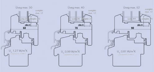 Az előbbi példa jól mutatja, hogy az üvegfalcmagasság korrekciójával jobb értéket kaphatunk, azonban ez a szilárdsági mutatók rovására nem növelhető a további mértékben. Nézzük meg, milyen értéket érhetünk el a szerkezet növelésével. Vegyünk egy 78-80 mm faanyagvastagságot. Ez már kecsegtetőbb választás lehet, hiszen már akár háromrétegű üvegezést is használhatunk, megengedve a maximális 40 mm-es üvegvastagságot. Ebben az esetben is igaz, hogy ha az üvegfalc magasságát növeljük, javulhatnak a mutatók. Azonban az Uw érték, 23 mm-es üvegfalcmagasság, Ug= 0,7 W/m2/K argongázas háromrétegű üveg esetén is még a bűvös 0,9-es érték fölött van, azaz Uw=0,99 W/m2/K-t eredményez. A technikai paraméterek lehetővé teszik az argongáz lecserélését a jobb hőszigetelést biztosító kriptonra, de ez az össz. ablakszerkezetet 30-50%-kal drágítja. A magasabb árat azonban a piac a legtöbb esetben rosszul tolerálja. Ésszerű megoldásnak tűnik a jobb paraméterek elérése érdekében a keresztmetszet további növelése. Nézzük meg, mit lehet elérni háromrétegű hőszigetelt üveggel 88-92 mm-es faanyagvastagsággal. Itt is 23 mm üvegfalcmagasságot érhetünk el, viszont a háromrétegű üvegvastagságot növelheti az 52 mm-re is. Argongázas Ug = 0,5 W/m2/K esetén az össz szerkezet már tudja az Uw= 0,81 W/m2/K tényezőt, ami már megfelel a várható előírásoknak.