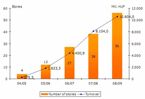 A Jysk Kft. a 2004. augusztusi alapítása óta feltűnően intenzív hálózatbővítéssel dolgozva (ma már 65 üzlet működik Magyarországon), évről-évre folyamatosan tudja növelni eladásait. Álljon itt egy grafikon a cég első 5 évéről (árbevétel millió forintban és üzletek száma). A cég 2010-ben +18%-al növelte a bevételeit!