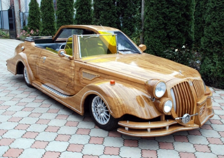 A ruszki: Nem véletlenül írtam ruszkit, és nem oroszt, valahogy ennek a szónak a lejtésében jobban ott van amit ez a gép képvisel, és legfőképp azért, mert egy ukrán építette. Vasily egy szép napon elővette az utolsó piros pricskát a zsebéből, mélán botorkált emlékei között, és rájött, hogy úgy ahogy van szar az élete. Előkotora a rég elfeledett bakancslistát, amin egy tétel szerepelt, építsd meg álmaid autóját...fából. Így is lett, munkájának búcsút intett, két autóját pénzre váltotta, és fél évre garázslakó lett, hogy életet leheljen Frankeinstein szintű művébe. Vagy inkább Harvey Dent volt rá nagy hatással, ugyanis simán lehetne kreálmánya a két-arc autója is mivel ez is félbe van vágva. Az egyik fele múltidéző, talán a 30as éveknek kéne eszünkbe jutni, a másik modern mindennapos faautó.