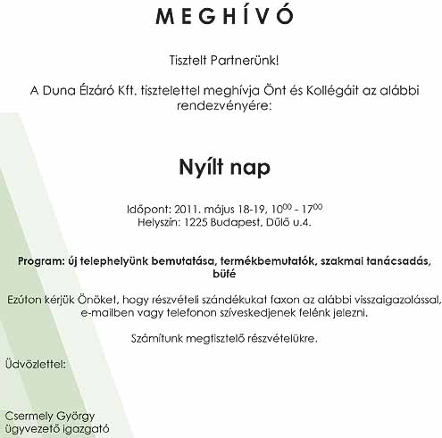 Duna Élzáró meghívó, nyílt nap, új telephely bemutatása