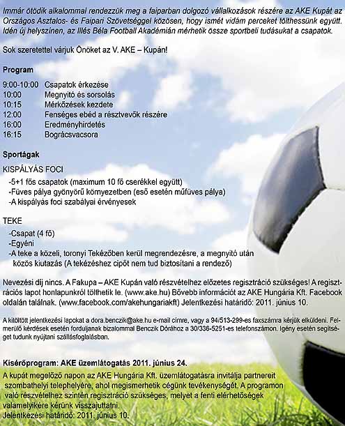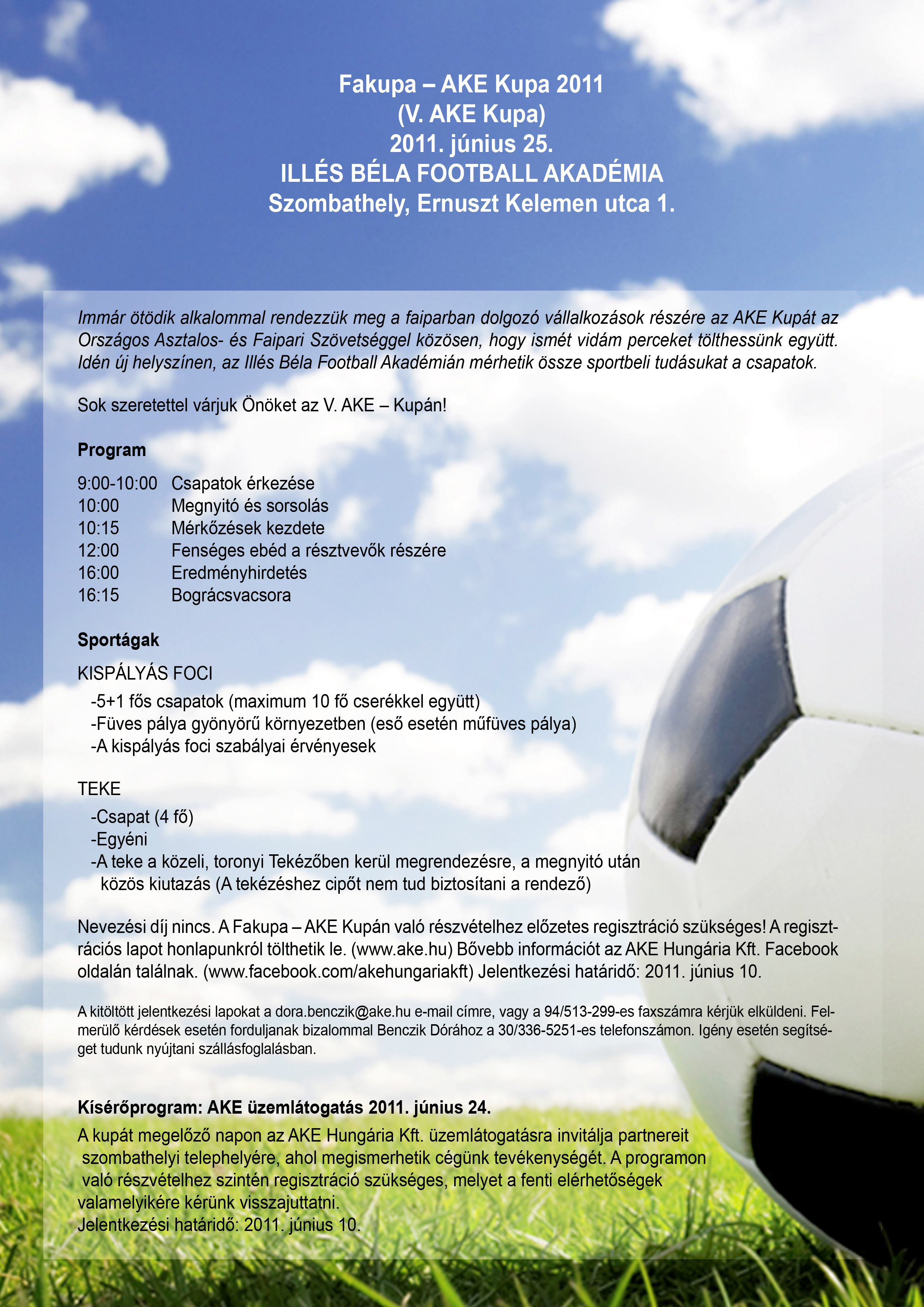 Nincs még programod június utolsó szombatjára? Szeretnél egy vidám napot a szakmabeliekkel eltölteni? Fa-AKE kupa 2011! Sportágak: foci (csapatban), teke női-férfi, egyéni és csapat.