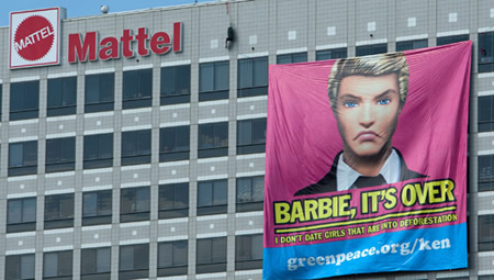 Az aktivisták a múlt héten a kaliforniai El Segundo-ban található Mattel főhadiszállásánál kifeszítettek egy molinót, amin Ken baba a következő szavakkal szakít a szőke szépséggel: "Barbie: vége van. Nem járok olyan lánnyal, aki támogatja az erdőirtást." Az épület előtt tartott demonstráció során egyébként 10 tiltakozót tartóztattak le. A Greenpeace most az interneten indítja meg következő offenzíváját a játékgyár ellen.