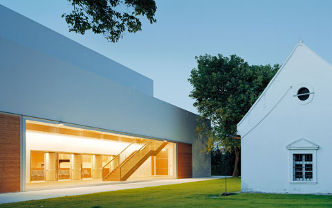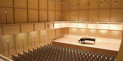 Az épület tiszta, szimmetrikus, visszafogott szerkezettel rendeklezik. A nyugalmat árasztó fehér falak nagy felületű üvegpadlókkal kapcsolják össze a külső és belső tereket. A közel 600 férőhelyes koncertterem belseje fával burkolt, a gondosan tervezett ívezéssel együtt a kamarazenének megfelelő akusztikát biztosítva.