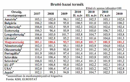 Hazai folyamatok 2010. IV. negyedévében a bruttó hazai termék 1,9%-kal, az év egészében 1,2%-kal bővült az egy évvel korábbi 4,3%-os, illetve 6,7%-os csökkenés bázisán. Az előző negyedévhez viszonyított - szezonálisan és naptárhatással kiigazított - index 0,2%-os növekedést mutat, így az ország gazdasági teljesítménye negyedik negyedéve emelkedik. A növekedés üteme éven belül gyorsult, ami azt jelzi, hogy a gazdaság növekedési pályára állt. A pozitív folyamatok ellenére sem sikerült még elérni a 2008. évi szintet a 2009 évben elszenvedett nagyarányú visszaesés következtében. A rendelkezésre álló adatok alapján egyértelműen leszűrhető, hogy a növekedés motorja a termékek és szolgáltatások külkereskedelme volt.