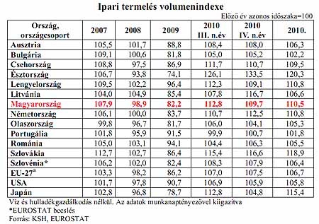 Az EU-27 gazdasági teljesítménye - szezonálisan és munkanaphatással kiigazítva - a negyedik negyedévben 2,1%-kal, 2010 egészében pedig 1,8%-kal emelkedett az egy évvel korábbihoz képest. Ilyen mértékű bővülés az elmúlt két évben nem volt. A növekedés motorja egész évben Németország volt, teljesítménye 3,6%-kal haladta meg az egy évvel korábbit. Ezzel a volumennövekedéssel jelentős szerepet játszott a környező országok gazdaságának beindításában, a növekedés gyorsításában. Ugyanakkor öt tagállamban folytatódott a recesszió. A korábban említetteken túl Romániában is komoly visszahúzó erőt jelent az államháztartás súlyos egyensúlytalansága. A spanyol és a lett gazdaság teljesítménye is enyhén mérséklődött éves szinten, a második félévben azonban ezek is növekedési pályára álltak. Az éves növekedési adatok alapján az EU átlagát meghaladó növekedés volt Szlovákiában (4%), Lengyelországban (3,8%), Németországban (3,6%), Észtországban (3,1%) és Csehországban (2,4%).