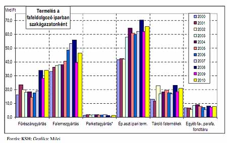 A hazai fűrészáru gyártás termelése 2010-ben 20,9%-kal nőtt, az egy évvel korábbi 20,4%-os csökkenést követően. Ezen belül a növekedés üteme hullámzó volt, az első negyedévben 35,9%, a másodikban 10,2%, a harmadikban 18,2%, a negyedikben pedig 23,4%. A hazai értékesítés 10,3%-kal, az export 48,4%-kal emelkedett, a 2009. évi igen alacsony bázison (belföldi értékesítés -4,7%, exportértékesítés -42,6%). 2010 decemberében a termelés 11,9%-kal, az export 69,4%-kal nőtt, míg a belföldi értékesítés 14,6%-kal csökkent 2009 decemberéhez képest. Az adatok egyértelműen jelzik, hogy a fűrészáru gyártás növekedése elsősorban exportvezérelt, bár a belföldi eladások bővülése is a növekedés irányába hatott. Az ágazat évközi hullámzó teljesítménye mögött több tényező húzódik meg: alacsony előző évi bázis, a javulás jelei a nyugat-európai és ázsiai piacokon, a forint árfolyam ingadozása, készletek pótlása, a hazai felhasználó ágazatok kedvezőtlen konjunkturális helyzete. A falemezgyártás, mely a fafeldolgozó-ipar termelésének negyedét adja, termelése 2010-ben 38,8%-kal emelkedett. Az időszakon belül a második negyedévben volt a legmagasabb a növekedés üteme, az első negyedévben 49,3%-os, a másodikban 73,1%, a harmadikban 34%, a negyedikben 15%-os volt a bővülés mértéke. A belföldi értékesítés 20,1%-kal (I.név 15,7%, II.név 22%, III.név 29,4%, IV.név 12,7%), az export 36,3%-kal (I.név 32,2%, II.név 66,3%, III.név 46,2%, IV.név 11,5%) nőtt. 2010 decemberében a termelés volumene 3,5%-kal emelkedett, a hazai értékesítés 12,2%-kal nőtt, az export pedig 6,2%-kal csökkent. A nagyarányú növekedés igen alacsony előző évi bázison jött létre, az építőipar és bútoripar változatlanul gyenge hazai állapota, illetve az európai felhasználó ágazatok lassú megindulása mellett. A termelés volumennövekedése hónapról hónapra tartósan magas, a 2008. harmadik negyedéve óta tartó csökkenést követően. A hazai értékesítés éves szinten már 2004 óta csökkent megszakítás nélkül, így múlt év kedvező változása igen-igen alacsony bázison valósult meg. A falemezgyártás kivitele 2008 negyedik negyedéve óta csökkent töretlenül, 2009 novemberétől azonban fokozatosan gyorsuló ütemben növekedett. A vásárosnaményi INTERSPAN termelésének leállítása várhatóan befolyással lesz az ágazat teljesítményére, átrendezi a termelés és kereskedelem arányát, illetve a szakág részesedését a faiparon belül, ez azonban a múlt évi számokban még nem jelentkezik.