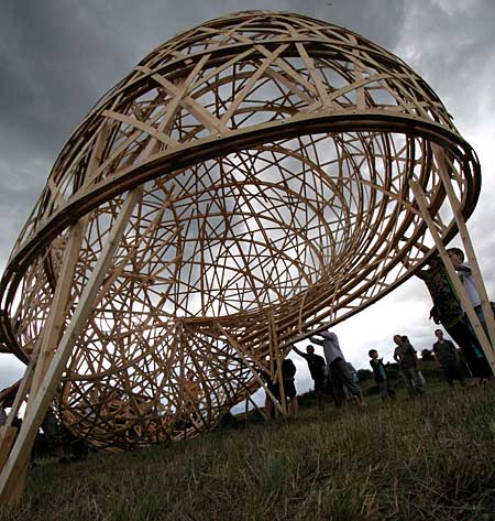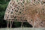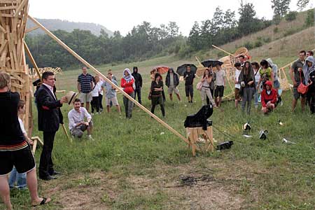 1.1. Csiga Csoportvezetők: Huszár András - építész, HA Építész Iroda és Nagy Nándor - építész, BLOKK Építész Műhely Csapattagok: Antal Ágota, Hertel Anna, Lázár Csaba, Müller Vilmos, Perge Diána A Csiga a Művészetek Völgye programsorozat hivatalos nyitó eseményéhez készült. A terv véglegesítését sok kísérletezés előzte meg. Kezdetnek a 4x4 cm-es léceket felszeletelték és a 3-6 mm-es darabok hajlíthatóságát vizsgálták meg, majd az építmény héját úgy alakították ki, hogy az hálós, merev rendszert alkosson. A projekt megvalósulásáért a csapat folyamatosan, feszített tempóban dolgozott, az alkotóhét ideje alatt pedig több látogató is csatlakozott hozzájuk hosszabb-rövidebb időre. Igyekeztek a szerkezetet minél könnyebbre készíteni, végleges súlya 300 kg alatt van, így 8-10 ember már meg tudja emelni azt.