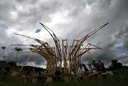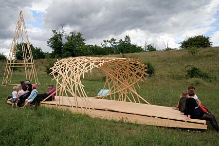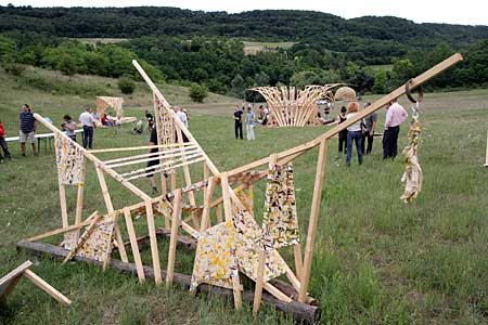 1.3. Anya Csoportvezetők: Losonczi Áron - építész, LiTraCon Kft. és Szabó Edit - kerámiatervező művész, Szabó Edit Design Csapattagok: Angyal Andrea, Bálint Ábel, Egeresi Nóra, Ilona, Szőke Zsófia, Pataki Attila István, Bakos Maxim Az alapötlet egy interaktív szerkezet létrehozása volt. Kezdeti inspirációjuk a kinyitható képeslap és a zongorabillentyű mozgásmechanizmusa volt, így csapatukkal az első napot a kísérletezés jegyében töltötték, különböző mozgásokat és mozgó elemeket modelleztek, ennek első eredménye a csápszerű szerkezetet, melyben 11 csuklópont és bonyolult szerkezeti felépítés eredményeként a lefelé irányuló mozgás felfelé irányuló mozgást generál. A lefelé irányuló mozgást a felhasználó indítja el azzal, hogy ráül vagy rááll a szerkezetre, ezáltal az rovarcsáp szerűen kinyílik. Az installációjuk 10 ilyen elemet tartalmaz, melyet a helyszín adottságaihoz igazítva félkör alakban helyeztek el a lejtős réten. Az elemek egymást támasztják, egyszerre vagy egymástól függetlenül is használhatóak.