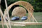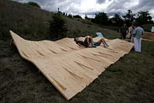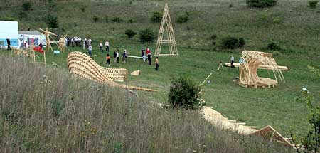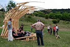 1.6. Kígyó Csoportvezető: Oliver Sales - építész, D.o.P. Studio Építész Iroda Csapattagok: Forró Emőke, Hajdu Gáspár, Molnár Péter, Zelenák Fruzsina Oliver és csapata a kezdetektől fogva önmagától alakuló, spontán dolgot szerettek volna létrehozni. Azonos alapelemeket kezdtek el készíteni, melyeket egymáshoz képest kicsit elmozdítva rögzítettek, így íves forma alakult ki összeállításukkor. A rögzítési mód megváltoztatása az ív megfordításának lehetőségét is biztosította, egy köztes elem, majd pedig egy tükörkép elem segítségével. Koncepciójukban így a monotonitás és a spontaneitás egyszerre szerepel, azonos elemekből véletlenszerűen kialakítható rendszert hoztak létre. A végleges forma kérdését az utolsó pillanatig nyitva hagyták, majd a csórompusztai réten kígyószerű alakzatot állítottak össze.