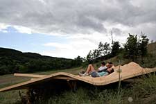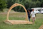 1.2. Falepedő Csoportvezető: Vass-Eysen Áron - építész, NART Építész Műterem Kft. Csapattagok: Glavatity Luca, Kós Tímea, Lenkai Anna Borbála, Török Tamás A csapat munkájának kiindulópontja a 40x40mm keresztmetszetű falécek hajlításának az a módszere volt, hogy keresztirányban, körfűrésszel bevágásokat készítettek. A hosszú ötletelés eredménye hatalmas pihenőágy lett, amely merev, mégis reflektál a környezetére. S-alakban hajlított lécekből álló elemek adják az alapfelületet, a megfelelő szilárdság eléréséhez pedig a csapat sokat kísérletezett az első napokban. Végül kitalálták a legjobb megoldást, aminél a bevágásokat egymástól 2 cm-re helyezték el. 3 m hosszú léceket soroltak egymás mellé és átkötésekkel rögzítették a struktúrát. A léceknél a hajlítás mértékét is fokozatosan változtatták, így a lepedő-szerű hullámzás keresztirányban is kirajzolódik az elemeken. Összesen 5 elemet készítettek el, mely egyszerre 10 embernek teszi lehetővé a táj szemlélését és a pihenést.