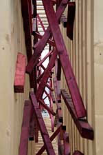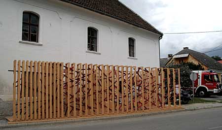 1.5. Rengeteg Csoportvezetők: Cseh András - építész, Czita Építész Iroda és Ványolós Endre - városépítész, Planwerk Építész Iroda Csapattagok: Gaál Zsombor, Müller Kinga, Tóth Anikó, Nagy Zsófia, Farkas Ádám Alapgondolatul egy helyszínhez köthető installációt vettek, mely meglévő térrészt egészít ki, miközben a helyszín is erősíti az installációt. A tervezést helyszínbejárással kezdték. Kapolcson találták meg a legizgalmasabb környezetet, a fő utcán, az evangélikus templom melletti háromszög alakú térre kezdtek el tervezni pihenésre és merengésre alkalmas installációt. Itt kezdték meg a háromszög alakú padozattal megalapozott, 2 falból álló tér elkészítését. A két fal keretekből áll, melyeket véletlenszerűen, festett maradéklécekkel erősítettek egymáshoz. A keret elemek egyre sűrűsödő rendszerben alkotják a falat, ami szemből átláthatatlan, ám oldalról nézve teljesen nyitott struktúrát alkot. A csoport fontosnak tartotta a tipográfusokkal való együttműködést, Horváth Janisz csapata az egyik keretbe erősített vászonra festett kalligráfiával tovább színesítette építményüket.