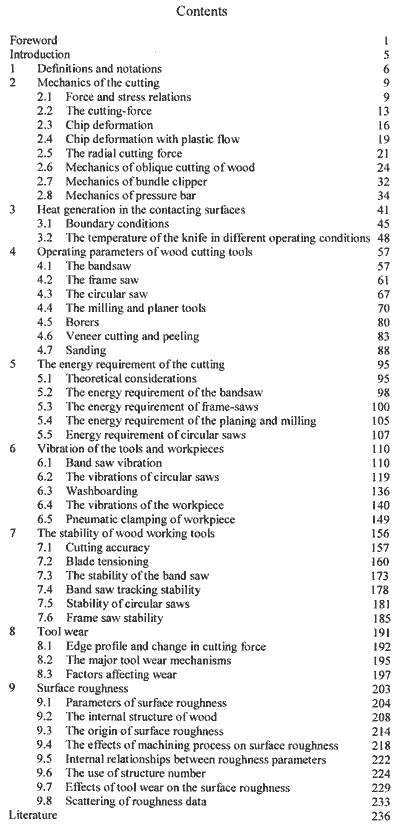 A forgácsoláselmélet eredményeit az ipar már használja is. A jelen könyv igyekszik összefoglalni a fent említett helyeken keletkezett eredményeket rendezett formában. Témáját tekintve tárgyalja a faipari gépek és szerszámok teljes vertikumát forgácsolási erő, szerszám hőterhelés, forgács deformáció, energiaszükséglet, üzemeltetési jellemzők, szerszám és munkadarab lengés, szerszámkopás és faanyag felületi érdesség szempontjából.