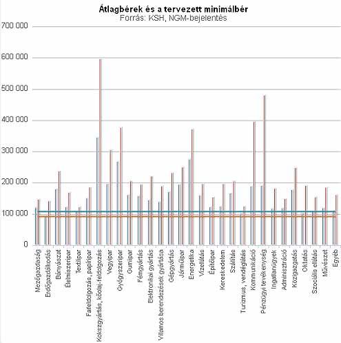 Mint látható, az oktatásban például 102 503 forint a fizikai dolgozók átlagbére, a szociális ellátásban és egészségügyben dolgozóké pedig nagyjából éppúgy 107 ezer, mint a textilipariaké. Ezekben az ágazatokban tehát a mostani fizikai átlagbér a jövő évi garantált bérminimumra sem lesz elég, és a minimálbért is alig haladja majd meg. Ráadásul míg az első példában szereplő erdőgazdálkodásban valóban csak néhány ezren dolgoznak, ezekben az ágazatokban már százezres tömeget érinthet a minimálbér és a bérminimum emelése. Az oktatásban nagyjából 48 ezer, az egészségügyi és szociális ágazatban csaknem 89 ezer ember végez fizikai munkát. A versenyszférában érintett ágazatok közül a textilipar még mintegy 38 ezer fizikai dolgozónak biztosít állást, a szállás- és vendéglátóhelyek további nagyjából 66 ezernek. Összesen ez csaknem 250 ezer ember. Egyes ágazatokban egyébként akkor sem sokkal jobb a kép, ha nemcsak a fizikai dolgozók bérét nézzük, hanem a szellemi dolgozókéval kiegészített teljes átlagbért. A textiliparban ennek összege is csak 123 ezer forint, míg a turizmusban 125 ezer. Az erdőgazdálkodás a magas keresetű szellemi dolgozóknak köszönhetően 140 ezres átlagbért biztosít, az egészségügyben és a szociális ellátásban átlag bruttó 154 ezret lehet keresni. Forrás: index.hu