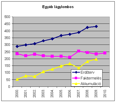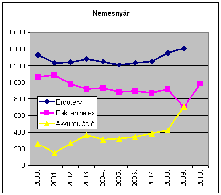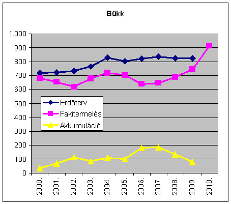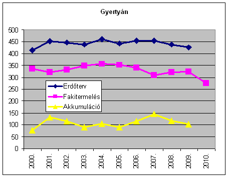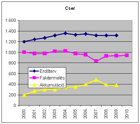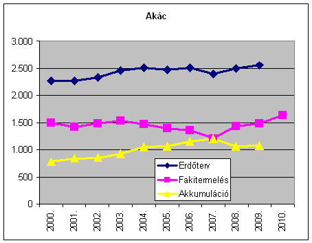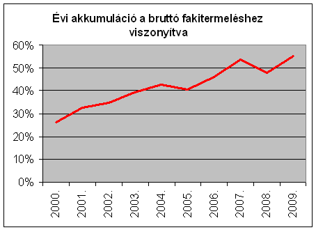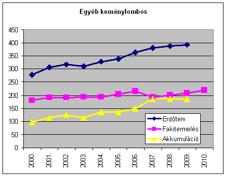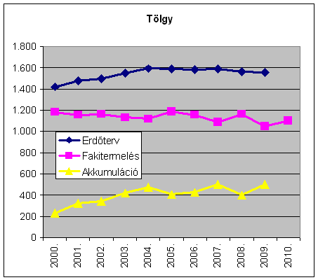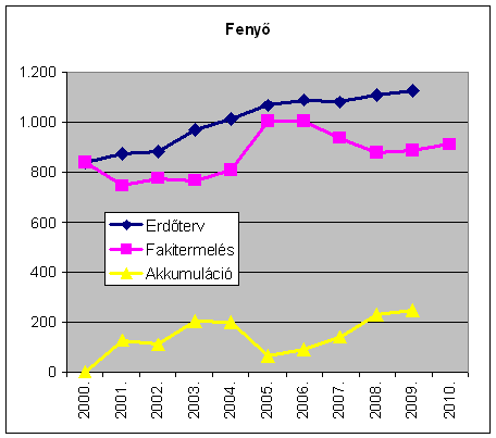 Az erdőtervi lehetőségek és a fakitermelés különbsége, az évi akkumuláció az évtized során folyamatosan emelkedve 1.896 e m-ről 2009-re 3.735 e m3-re, tehát lényegében a duplájára nőtt. A fakitermelés ugyanakkor részben a viharkárok miatti 2010. évi növekedésével is az évtized egészében lényegében változatlan. A hazai erdőkben tehát jelentős tartalékok gyűlnek a különböző fafelhasználási célok keresletének, leendő keresletélénkülésének kielégítésére. (A nem erdőgazdálkodók részére: Vigyázat az alábbiak bruttó fakitermelési és lehetőség adatok, amivel szemben tényleges árualapként a mintegy 15-20%kal alacsonyabb értéket mutató nettó m3 adatok lennének figyelembe vehetőek! Ez utóbbira azonban nincs országos statisztika az erdőgazdálkodók jelentései alapján.)