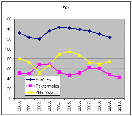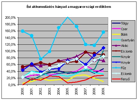 A fűz kiugrik a többi közül ugyanakkor összmennyisége az összes fafaj közül a legkisebb. Az akác, az egyéb keménylombos, az egyéb lágylombos és a hazainyár, amelyek hányadosa jellemzően 60% fölötti, különösen az utóbbi években. Ezek közül az akác képvisel jelentős mennyiséget évi másfél millió m3 körüli fakitermelésével és egymillió m3-t már hosszabb ideje meghaladó akkumulációjával. Az akác esetében ez annyiban különös, hogy a kitermelést fékező természetvédelmi korlátozások e fafajnál nem jellemzőek, a terepviszonyok sem lehetnek hátráltatóak, a piac sem lehet ennek oka, hiszen 2008-ban és az egész évtizedben 2000-et kivéve 60% körüli, majd 70%-ot, sőt 80%-os is meghaladó értékeket is mutat e fafaj.