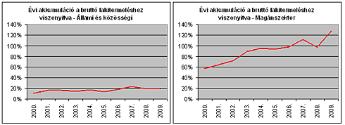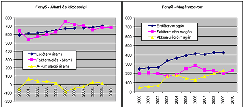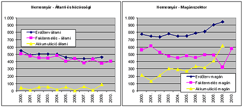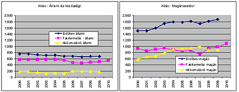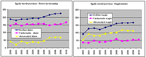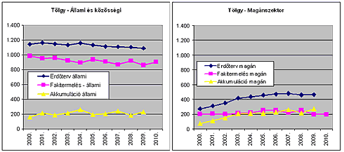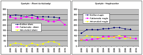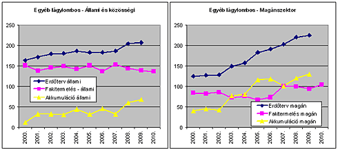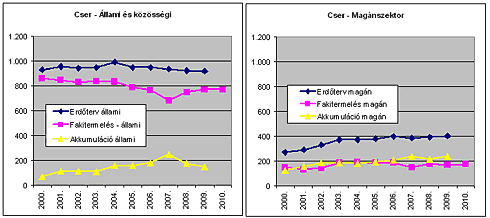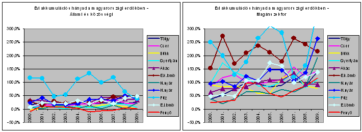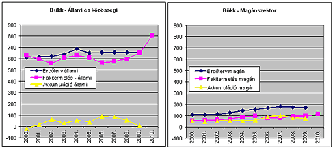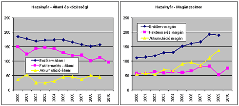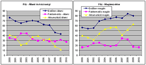 Az államiak erdőtervi lehetősége változatlan, vagy egészen enyhén csökken, míg a magán erdőgazdálkodók erdőtervi lehetősége határozott növekedést mutat: közel 1,5 millió m3-rel nagyobb az évi lehetőség, sőt ha ismernénk a 2010. évi adatot, lehet hogy e növekmény meg is haladta a 1,5 millió m3-t. A fakitermelésben az államiaknál az évtized első kétharmadában jól érzékelhető a visszaesés, amit ugyan növekedés követett, de 2010-re sem lett több, mint 2000-ben volt. A tendencia tehát enyhén csökkenő. A magánosoknál a fakitermelés ugyanakkor enyhén növekvő, amely adatsorból kicsit kilóg a 2010. évi erősebb termelésbővülés. A magánosok fakitermelése azonban messze nem követte a lehetőségek bővülését. Az akkumuláció terén az látható, hogy az államiak nagyjáből egyenletesen és jobban kihasználják a lehetőségeket, mint a magán erdőgazdálkodók. Az utóbbi körben az időszak elejei 1,35 millió m3-ről a végére 2,86 millió m3-re nőtt! A magán erdőgazdálkodók tehát valamilyen okból nem tudják vagy nem akarják kihasználni fakitermelési lehetőségeiket. Legalább is az MGSZ-EI adataiból ez olvasható ki.