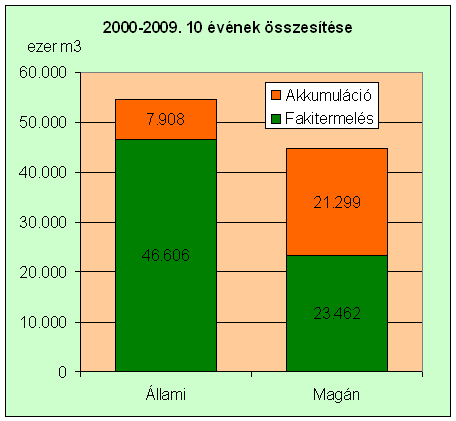 Végül összesítő grafikon az állami és magán erdőgazdálkodók 2000-2009. időszak 10 évének fakitermeléséről és az erdőtervekben kapott lehetőség ki nem használásáról, tehát az akkumulációról. Az államiak a 10 évi 54.514 ezer m3 erdőtervi lehetőségük 85,5%-át kitermelték, ugyanakkor a magántulajdonosok a 44.761 ezer m3 lehetőségüket 52,4%-ban használták ki. A magánerdők ezen 10 évi 21.299 ezer m3-es akkumulációjának több mint felét teszi ki a két nagy tétel, az akác 8.290 ezer m3-e és a nemesnyár 3.129 ezer m3-e. (A mennyiség természetesen itt is bruttó m3, amihez képest az áruforgalomba kerülő, erdőből kihozott, illetve kihozható fa nettó m3-e 15-20%-kal kevesebb.)