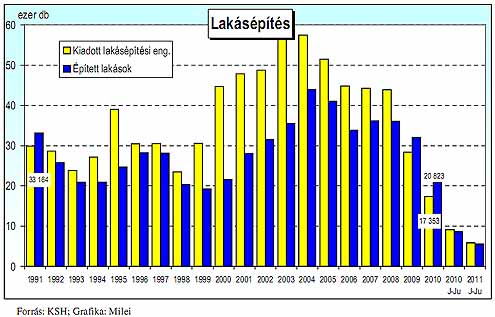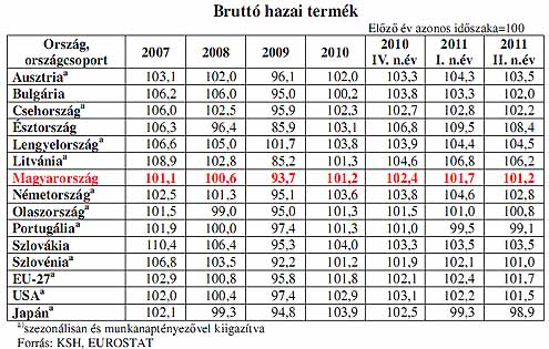 Hazai folyamatok 2011. II. negyedévében a bruttó hazai termék 1,5%-kal bővült - kiigazítatlan adatok alapján - az egy évvel korábbi 1%-os növekedés bázisán. Az első és második negyedévi növekedés az els ő félév átlagában 1,9%-os bővülést eredményezett. Az előző negyedévhez viszonyított - szezonálisan és naptárhatással kiigazított - index stagnált. A szezonálisan és naptárhatással kiigazított index szerint 1,2%-os volt az emelkedés az egy évvel korábbihoz képest, ezzel az uniós tagállamok rangsorában a középmez őny végén helyezkedünk el. A rendelkezésre álló adatok alapján egyértelm űen leszűrhető, hogy a növekedés motorja továbbra is az ipari termelés és a termékek és szolgáltatások külkereskedelme volt. A feldolgozóipar termelése az els ő félév során 8,6%-kal, kivitele 11,0%-kal, belföldi értékesítése pedig 2,4%-kal volt magasabb az egy évvel korábbinál. 2011 júniusában 2,1%-kal csökkent a feldolgozóipar teljesítménye, belföldi értékesítése 4, míg kivitele 1,2%-kal volt alacsonyabb, mint egy évvel korábban. 2011. I. félévében 35,2%-kal csökkent a használatba vett lakások száma az egy évvel korábbihoz képest. A csökkenés valamennyi településtípust és régiót érintett, a legkevésbé Dél-Alföldet (-11,4%), illetve Észak-Alföldet (14,6%), legnagyobb mértékben Nyugat-Dunántúlt (-49,5%), illetve Észak-Magyarországot (-48,4%). A kiadott új lakásépítési engedélyek száma 35,9%-kal visszaesett 2011. januárjúniusában. Ez a folyamat a lakásépítések további csökkenését jelzi az év hátralév ő részében. A kiadott építési engedélyek száma épphogy meghaladja a használatba vett lakások számát. Budapesten 66,1%-kal kevesebb, a megyei jogú városokban 15,4, a községekben 1,9%-kal, a kisvárosokban 22,9%-kal kevesebb új engedélyt adtak ki, mint egy évvel korábban.
