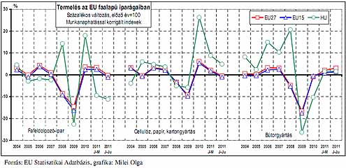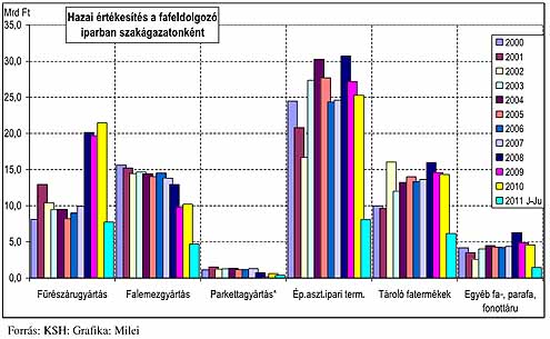 A fafeldolgozó-ipar termelése 2011 I. félévében 10,2%-kal csökkent az egy évvel korábbi 21,4%-os növekedéshez képest. 2011 júniusában 18,3%-kal esett vissza a termelés az előző év 3,2%-os növekedést követően. A szakágazat hazai értékesítése 2011. első félévében 22%-kal zuhant, júniusban pedig 24,9%-kal. Az első hat havi exportértékesítés 3%-kal mérséklődött, júniusban pedig a szakágazat kivitele 18,1%-kal esett az egy évvel korábbihoz képest. A hazai bútoripar 2009-ben kezdődött mélyrepülése 2011. első hat hónapjában megállni látszik. Az ágazat termelése 2,0%-kal emelkedett. A belföldi értékesítés még változatlanul csökken, mértéke azonban lényegesen lelassult (-5,0%). Az export a januárjúniusi id őszakban 5,1%-kal bővült, ezen belül júniusban 3%-kal elmaradt az egy évvel korábbitól.