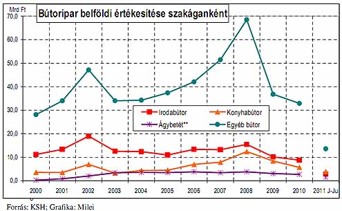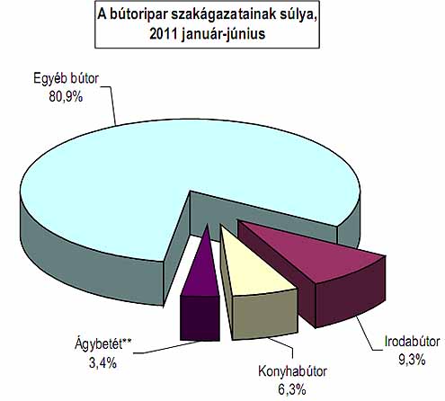 Az irodabútorok gyártása területén 2008 év végén megindult kedvezőtlen folyamatok tovább erősödtek 2009-ben. 2010-ben változatlanul a negatív tendenciák érvényesültek, de a korábbi ütem enyhült. A szakág termelése ez év első félévében 8,3%-kal, belföldi értékesítése 17,9%-kal csökkent, kivitele ugyanakkor 30,3%-kal emelkedett. A féléven belül a második negyedév kedvezőtlenebb képet mutat mint az első, a termelés és belföldi értékesítés visszaesésének üteme gyorsult, míg az kivitel növekedése kissé lassult. 2011. júniusában a termelés 25,1%-kal, a belföldi értékesítés 41,3%-kal zuhant, a kivitel azonban még 18%-kal bővült az előző évi alacsony bázishoz képest. A félév egyes hónapjaiban - a márciust kivéve - a termelés és belföldi értékesítés csökkent, a második negyedévben gyorsuló ütemben. A kivitel mind a hat hónapban jelentős mértékben emelkedett eddig azonban nem tudott a növekedés motorjává válni. 2008-ban a konyhabútorgyártás termelése 52,1%-kal, a kivitel 36,3%-kal, a belföldi értékesítés 57,4%-kal emelkedett. A 2009-ben bekövetkezett negatív fordulat 2010-ben tovább folytatódott, a visszaesés üteme változatlan. 2011. els ő félévében fordulni látszik a kocka. A termelés 16,9%-kal az export 275,6%-kal nőtt 2010. azonos időszakához képest. A belföldi értékesítés még mindig gyengélkedik (építőipar gyenge teljesítménye, lakossági és intézményi fogyasztás csökkenése), 10,3%-os visszaesést mutat. 2011. júniusában a termelés 6,1%-kal, a kivitel 290%-kal b ővült az egy évvel korábbi igen alacsony bázishoz képest. A hazai értékesítés változatlanul csökken (-14,5%). A rendelkezésre álló havi adatok szerint a termelés és a kivitel a félév valamennyi hónapjában gyorsuló ütemben n őtt. A belföldi értékesítés a márciusi növekedést ől eltekintve, minden hónapban mérséklődött.