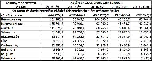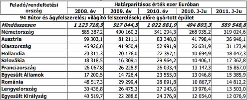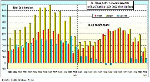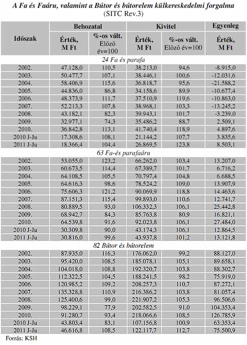 ... A fa alapanyagok 2011. első félévi forgalma pozitív egyenleggel zárt, mértéke meghaladja a 8,5 milliárd forintot, ami 4,7 milliárd forinttal múlja felül az egy évvel korábbit. A behozatal forintban 4,4%-kal, kivitelünk pedig 23,8%-kal nőtt. A fatermékek kivitele az első hat hónapban 1,2%-kal emelkedett, míg behozatalunk 0,4%-kal csökkent. Az egyenleg 2%-kal növekedett az export és import ütemnövekedésének kismértékű különbsége miatt. 2011 január-júniusban a bútor és bútorelem behozatal 8,5%-kal bővült. Az árucsoport kivitele a vizsgált időszakban 12,7%-kal emelkedett az egy évvel korábbihoz képest. Az árucsoport egyenlege 12,1 milliárd forinttal kedvez őbben alakult, mint az előző évben..