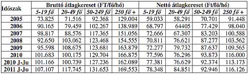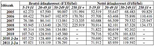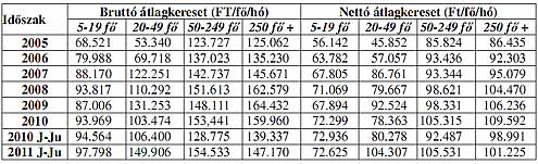 A versenyszférában, teljes munkaidben foglalkoztatottak átlagkeresete, Ft ERDŐGAZDÁLKODÁS Az erdőgazdálkodással foglalkozó vállalkozások kereseti adatai szerint sem a bruttó, sem a nettó keresetek nem érik el a versenyszféra átlagát, nemzetgazdasági szinten a legalacsonyabbak közé tartozik. 2011. első hat hónapjában a bruttó kereset 6,8%-kal, a nettó keresetek 3,1%-kal emelkedtek. Ezen belül a legkisebb mértékű emelkedés a mikró vállalkozások esetében következett be, a bruttó kereset +4,5%, a nettó kereset 0,2%kal növekedett. A legmagasabb emelkedés a 20-49 fős vállalkozások körében következett be, a bruttó kereset 40,9%-kal, a nettó kereset 29,9%-kal emelkedett.
